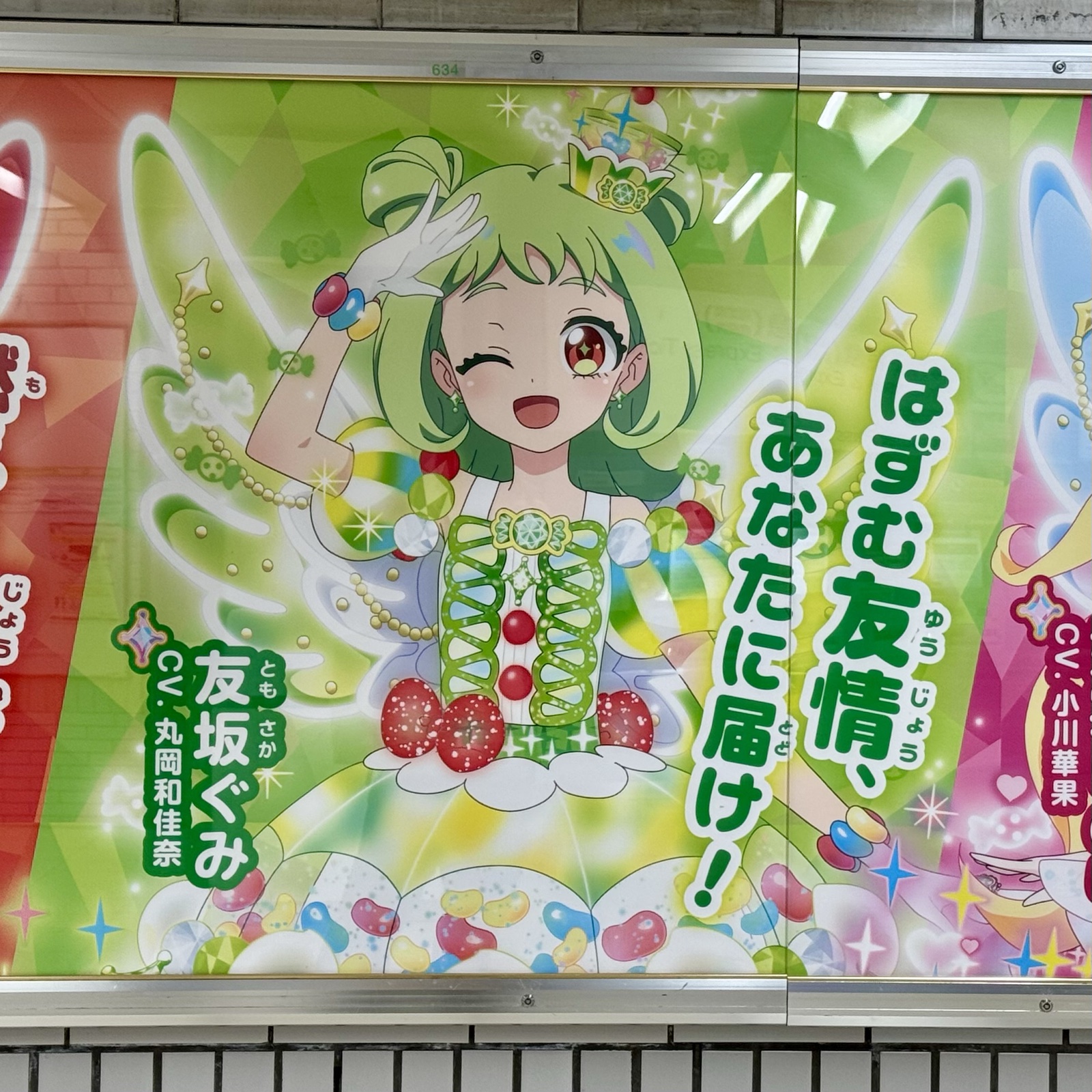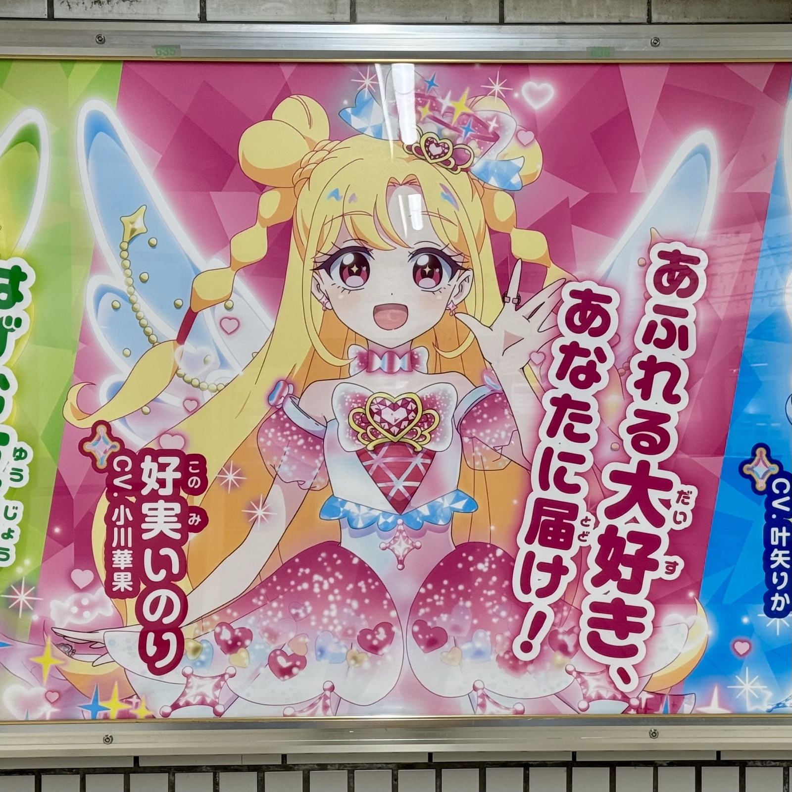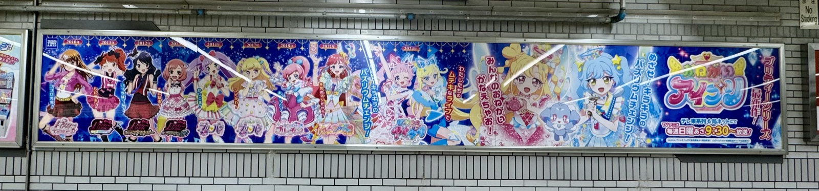 キャラクター全員が揃う集合ビジュアルに加えて、個別のカットや過去のプリティーシリーズのキャラが大きくあしらわれた構成で、撮影スポットとしても優秀でした。
